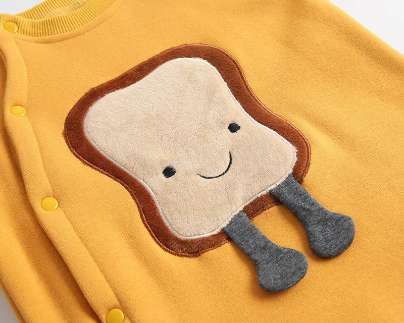 This adorable baby jumpsuit with a fun cartoon design is made of soft cotton that will make your little one feel like a star on any occasion. This versatile jumpsuit is perfect for everyday wear. The fun design of this romper makes it an adorable addition to any wardrobe. The design comes in toast, eggs, and clouds.