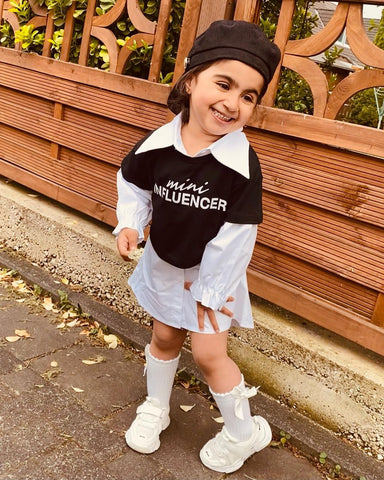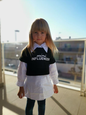 The Mini Influencer Tee in Black is cut from a soft cotton jersey and has a classic crew neckline, twisted rolled sleeves, and mini influence printed in contrast white on the chest. This tee comes with a matching white shirt to match with. This tee looks cool with denim and soft tailoring or paired back with our boots or shoes.