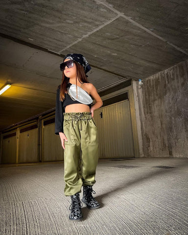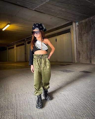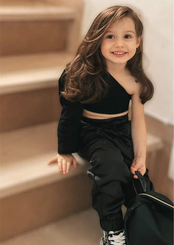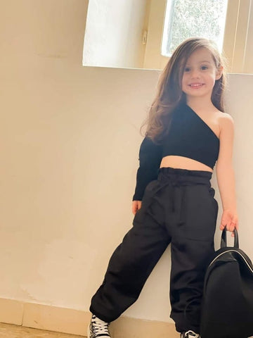 Showcase this chic fashion outfit for your girls. Team a black off-shoulder top and coordinating elastic pants for a trendy vibe. Featuring a paper bag waist and front tie. Cut from soft and comfy fabric that suits your kids. A simple yet statement-making outfit for your girls!