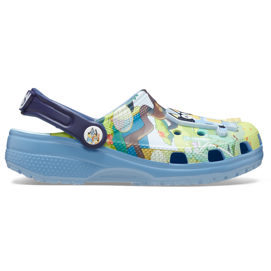 Cheese and Croc-ers! The Bluey x Crthtocs collection has arrived, with these Bluey Classic Clogs for toddlers. An all-over print provides a backyard playground for oversized Bluey and Bingo Jibbitz邃「 charms, as they try to keep the red balloon in the air. And little ones can join the fun!
