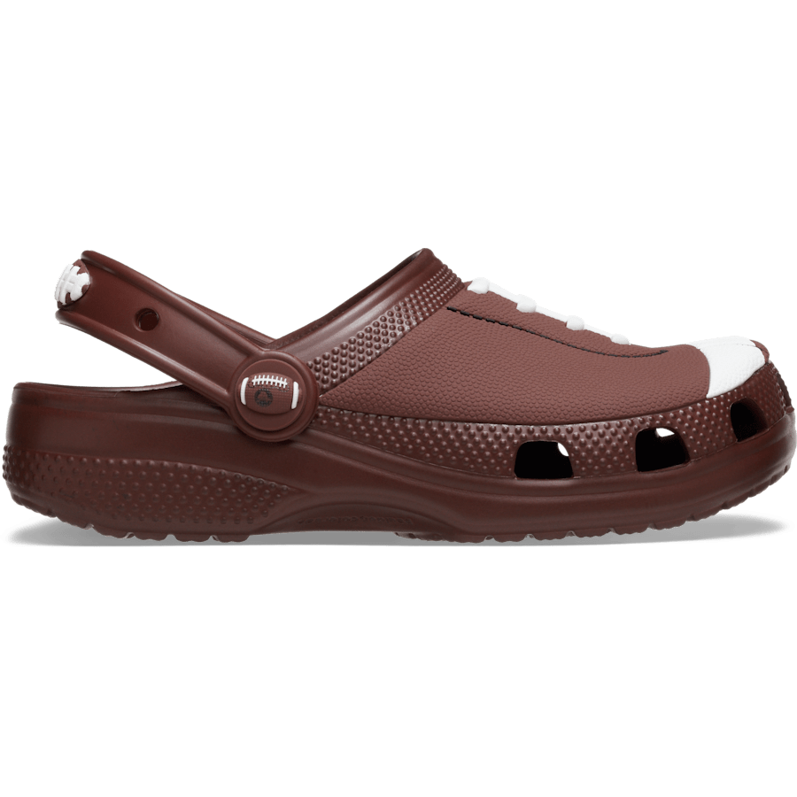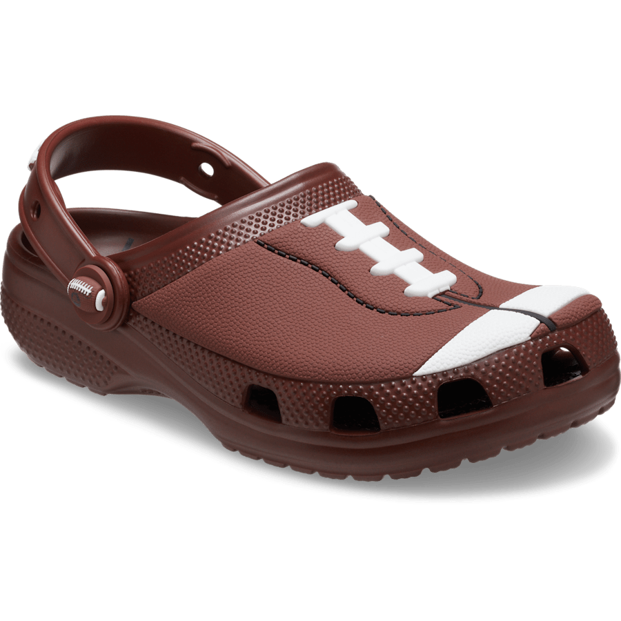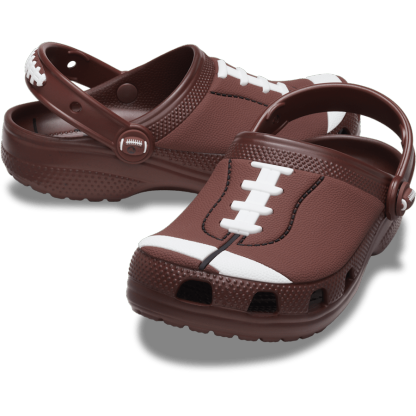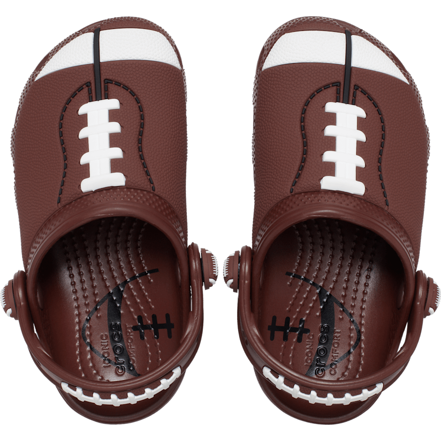 This version of the iconic clog is specially designed for young football fans. Featuring a unique upper inspired by the iconic football design, and football inspired rivets and fixed patch on the backstrap, these clogs will help little ones show off their love of football. Plus, a football puzzle graphic on the insoles helps little ones put the shoe on the correct foot. Crthtocs offers a variety of Classic Clogs for Kids and Toddlers that feature original character-rich graphics and other inspired designs to help kids express themselves and engage new friends, resulting in more fun for the little ones.