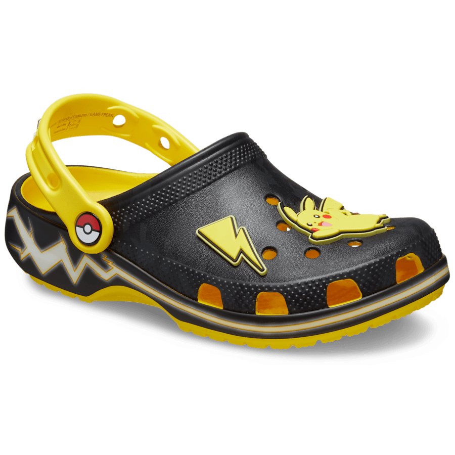 It窶冱 time to go dark mode with the electrifying new Pikachu Classic Clog. The all-black upper meets striking shades of Pikacku yellow on the ankle strap and interior footbed, with a Pokテゥ Ball graphic decorating the rivet and heel cup. A lightning strike graphic wraps around the sole with 4 exclusive Pikachu-themed Jibbitz邃「 charms decorating the top of the clog.