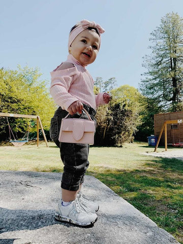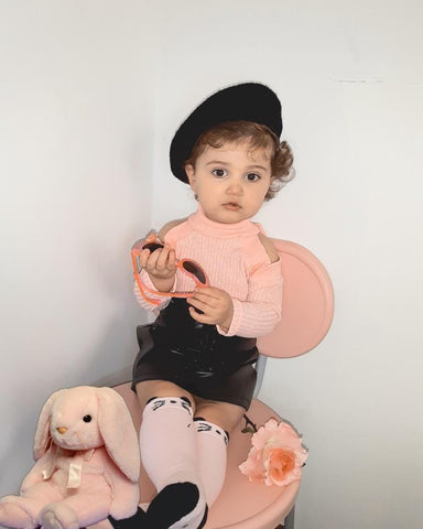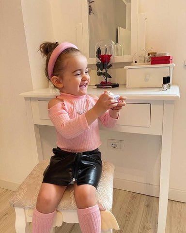 An off-shoulder knitted sweater in a cotton blend. It is made of high-quality material. The material is soft and gentle to the baby's skin.  This top comes with a matching A-line mini skirt.